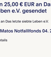 Datum Spender Betrag Gespendet an 01.03.2024 Carolin M. 31,- Euro Notfallfonds 01.03.2024 Annemarie Sch. 5,- Euro Notfallfonds 01.03.2024 FB Flohmarkt 80,50 Euro Notfallfonds 01.03.2024 Teaming 54,- Euro Notfallfonds 01.03.2024 Judith Sp. 1,- Euro Notfallfonds 01.03.2024 Claudia N. 2,- Euro Notfallfonds 01.03.2024 Hako-Med 4,- Euro Notfallfonds 01.03.2024 Heike S. 2,- Euro Notfallfonds 01.03.2024 Alice P. 10,- Euro Notfallfonds 01.03.2024 Roswitha K. 10,- Euro Notfallfonds 02.03.2024 Ewald T. 30,- Euro Notfallfonds 04.03.2024 Jacqueline H. 10,- Euro Notfallfonds 05.03.2024 Kathrin I. 5,- Euro Notfallfonds 05.03.2024 Heidi R. 5,- Euro Notfallfonds 06.03.2024 Notfallfonds 25,- Euro Svetlana 07.03.2024 Notfallfonds 25,- Euro Teaming 16.03.2024 Notfallfonds 50,- Euro TSV Werratal e. V. 25.03.2024 Andrea K. 20,- Euro Notfallfonds 27.03.2024 Notfallfonds 50,- Euro VKiN 28.03.2024 Notfallfonds 14,90 Euro Baumpflanzung Gesamt Einnahmen: 269,50 Euro