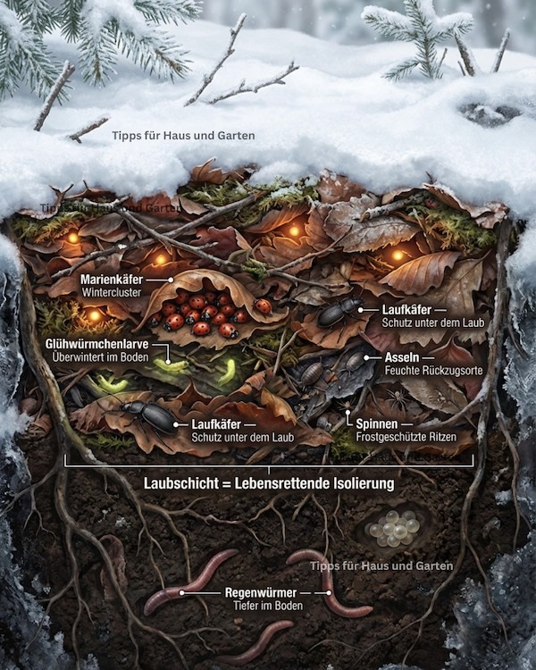 • Glühwürmchenlarven überwintern tief im Boden – ohne Laub keine Sommerlichter.