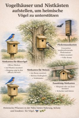 Vogelhäuser und Nistkästen sind eine einfache Möglichkeit, die Natur direkt im eigenen Garten zu unterstützen. Sie bieten Vögeln sichere Brutplätze und helfen dabei, die Artenvielfalt zu erhalten. In Kombination mit heimischen Pflanzen entsteht ein lebendiger Garten, in dem Vögel, Insekten und andere Tiere ein Zuhause finden.